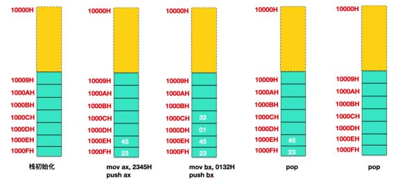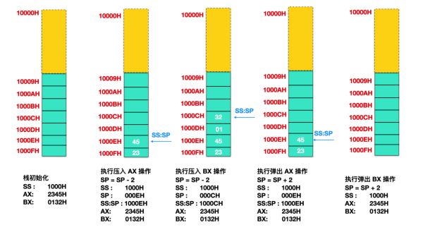 。比如 push ax 会把 ax 寄存器中的数据压入栈中,pop ax 表示从栈顶取出数据送入 ax 寄存器中。