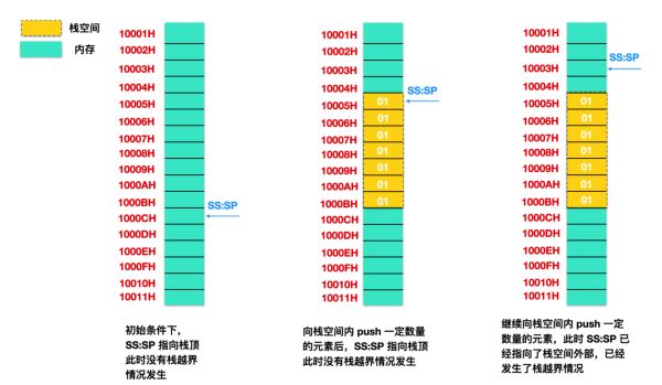 第一开始,SS:SP 寄存器指向了栈顶,然后向栈空间 push 一定数量的元素后,SS:SP 位于栈空间顶部,此时再向栈空间内部 push 元素,就会出现栈顶越界问题。