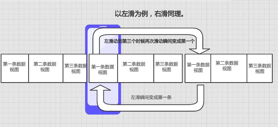 第一步,数据倍数增加,一般为3倍,我们只显示中间那些数据即可,我们向左滑动的时候,滑到中间数据的最后一条数据的时候继续滑动的时候要瞬间换成中间的第一条数据。如果向右滑动的时候,如果当前是第一条数据那么就瞬间移到中间的最后一条数据上。这样看起来就是无限循环了。一图胜千言,有图为证。