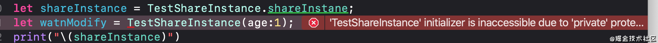 在类中,将TestShareInstance的init方法设置为了private,这能保证其他人没有办法调用你的init的方法,只能调用你的shareInstane单例变量;从而保证了单例的不可修改特性。如果你要强行修改,编译器就会警告你,具体示例如下