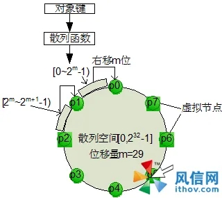 - 5. 如图所示,以逆时针方向递增的散列空间有 4 个字节长共 32 位,整数范围是[0~232-1];将散列结果右移 m 位,可产生 232-m个虚拟节点,例如 m=29 时可产生 8 个虚拟节点。在实际部署的时候需要经过仔细计算得到合适的虚拟节点数,以达到存储空间和工作负载之间的平衡。