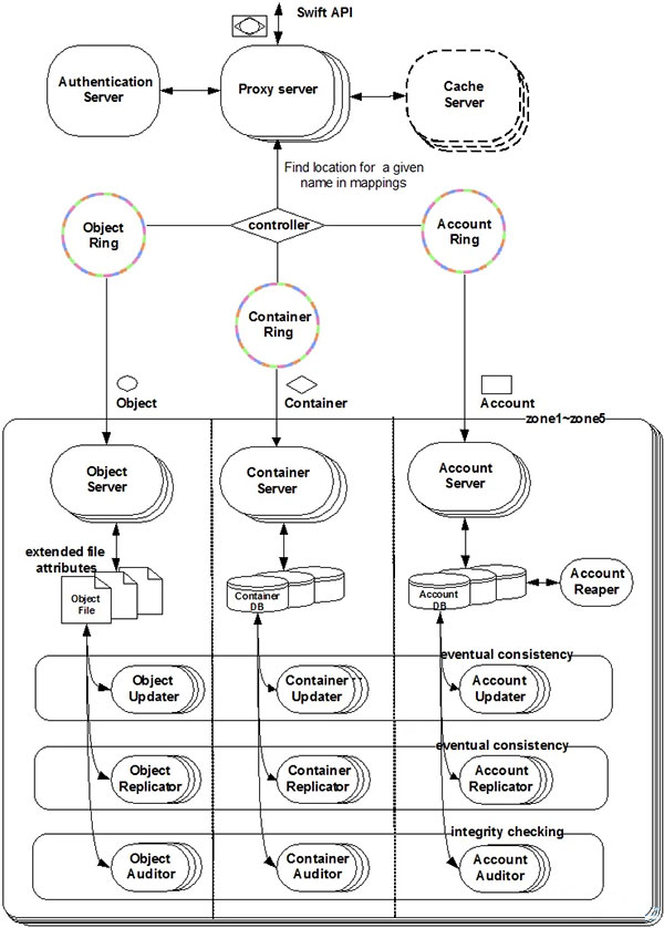 1. 代理服务(Proxy Server):对外提供对象服务 API,会根据环的信息来查找服务地址并转发用户请求至相应的账户、容器或者对象服务;由于采用无状态的 REST 请求协议,可以进行横向扩展来均衡负载。