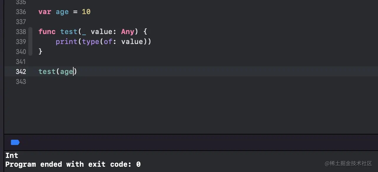 可以看到,在编译期间就能知道a的类型是Int,因为初始化数据的时候赋值的是Int类型数据,但是在test方法的形参定义的类型是Any,因此在编译期间并不知道其形参类型,所以将a传入时也被编译器当作是Any类型,但是在运行时,可以动态得知传入的a是Int类型,因此type(of:)就可以用来获取当前值在运行时的实际类型。