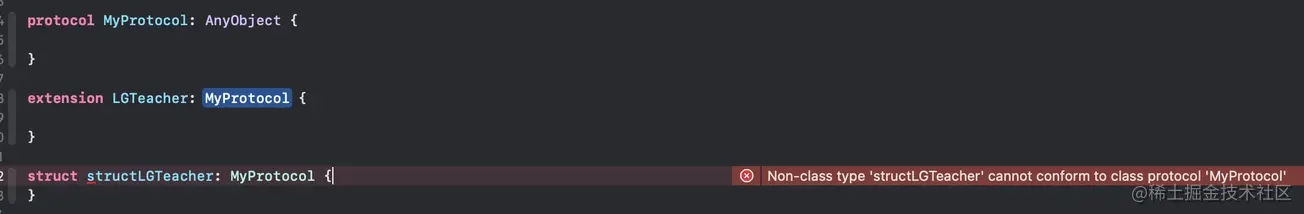 这里使用了AnyObjcct来修饰协议,可以看到,当struct类型的structLGTeacher去遵循协议时,编译器会报错。只允许class类型遵循协议。