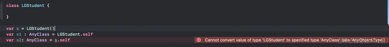 我们可以看到,AnyClass的定义就是AnyObject.Type,也就是实例对象的类型,所以我们不能用具体的实例对象赋值给AnyClass,编译器会报错。