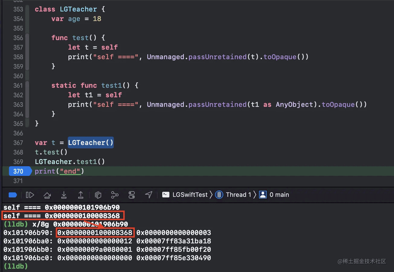 从代码中,我们可以看到,当我po t 和po t1时,可以看到t和t1指向同一个地址。然后当我po t2时,发现打印出来的是LGTeaher类型。接下来我用x/8g命令打印t2,打印出t2的内存地址。再打印出t的内存地址,然后打印t里面存储metadata的内存地址。发现和t2的内存地址一模一样。