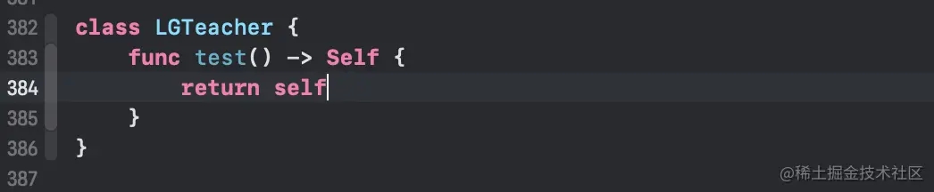所以,在 T.self 中,当 T 为实例对象的时候,T.self 返回的是实例对象本身。当 T 为类的时候,T.self 返回的是一个元类型,也就是前面讲的元数据(metadata)。