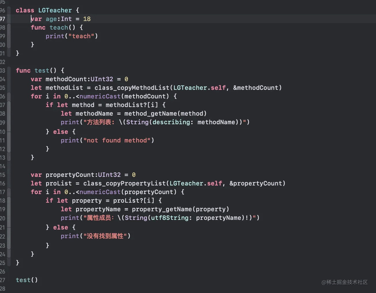 在OC中,我们可以通过Runtime特性来获取一个类的属性和方法。而Swift中没有Runtime,能使用OC的Runtime获取一个类的属性和方法吗?我们通过代码测试一下。