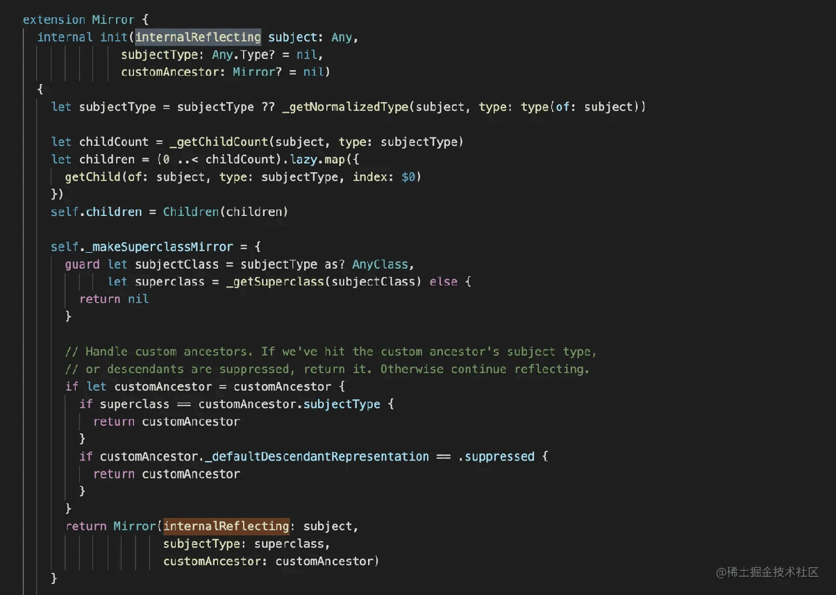 ⾸先我们现在源⽂件⾥⾯搜索Mirror.Swift,在源码中我们可以很清晰的看到Mirror是由结构体实现的,我们忽略掉⼀些细节,快速定位到初始化的⽅法