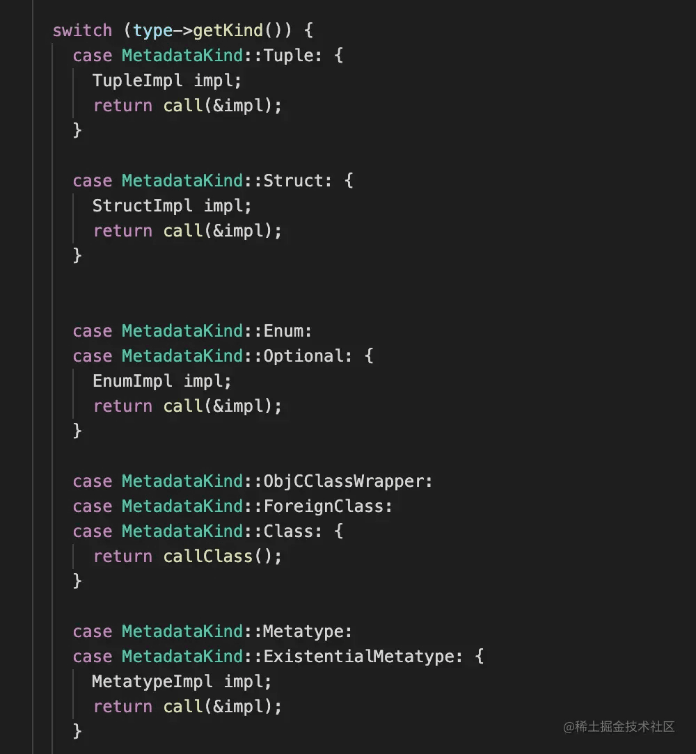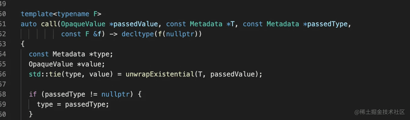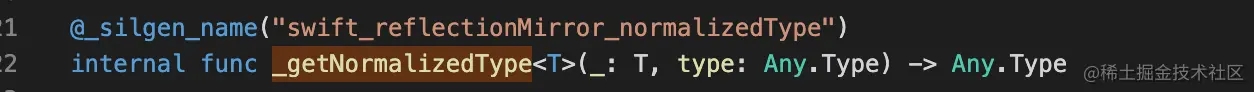 这个函数返回的是Metadata类型的指针,也就是Swift函数中的Type类型。可以通过这个函数获取到每个函数的类型。但是这个函数是C++函数,需要把它转换成Swift函数。这里参考了HandyJSON这个第三方库,使用@_silgen_name映射成swift函数。具体代码如下:
