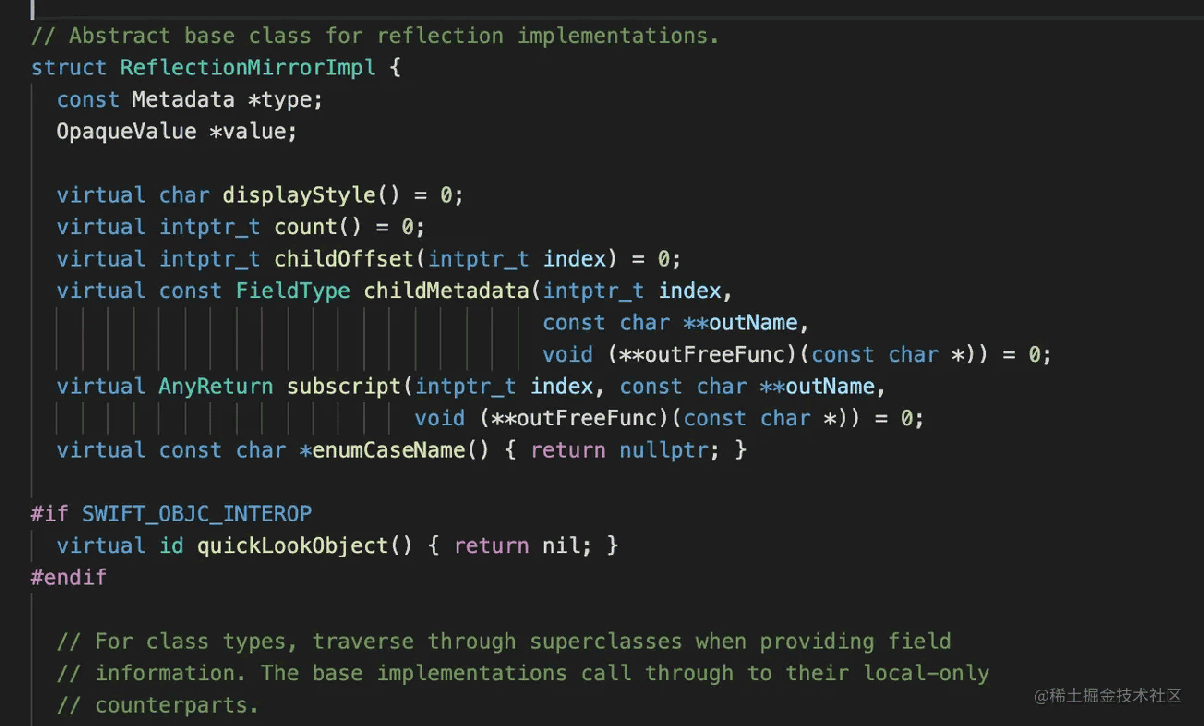 所谓反射就是可以动态获取类型、成员信息,在运⾏时可以调⽤⽅法、属性等⾏为的特性。在使⽤OC开发时很少强调其反射概念,因为OC的Runtime要⽐其他语⾔中的反射强⼤的多。但是 Swift 是⼀⻔类型安全的语⾔,不⽀持我们像 OC 那样直接操作,它的标准库仍然提供了反射机制来让我们访问成员信息,Swift 的反射机制是基于⼀个叫 Mirror 的结构体来实现的。然后就可以通过它查询这个实例。