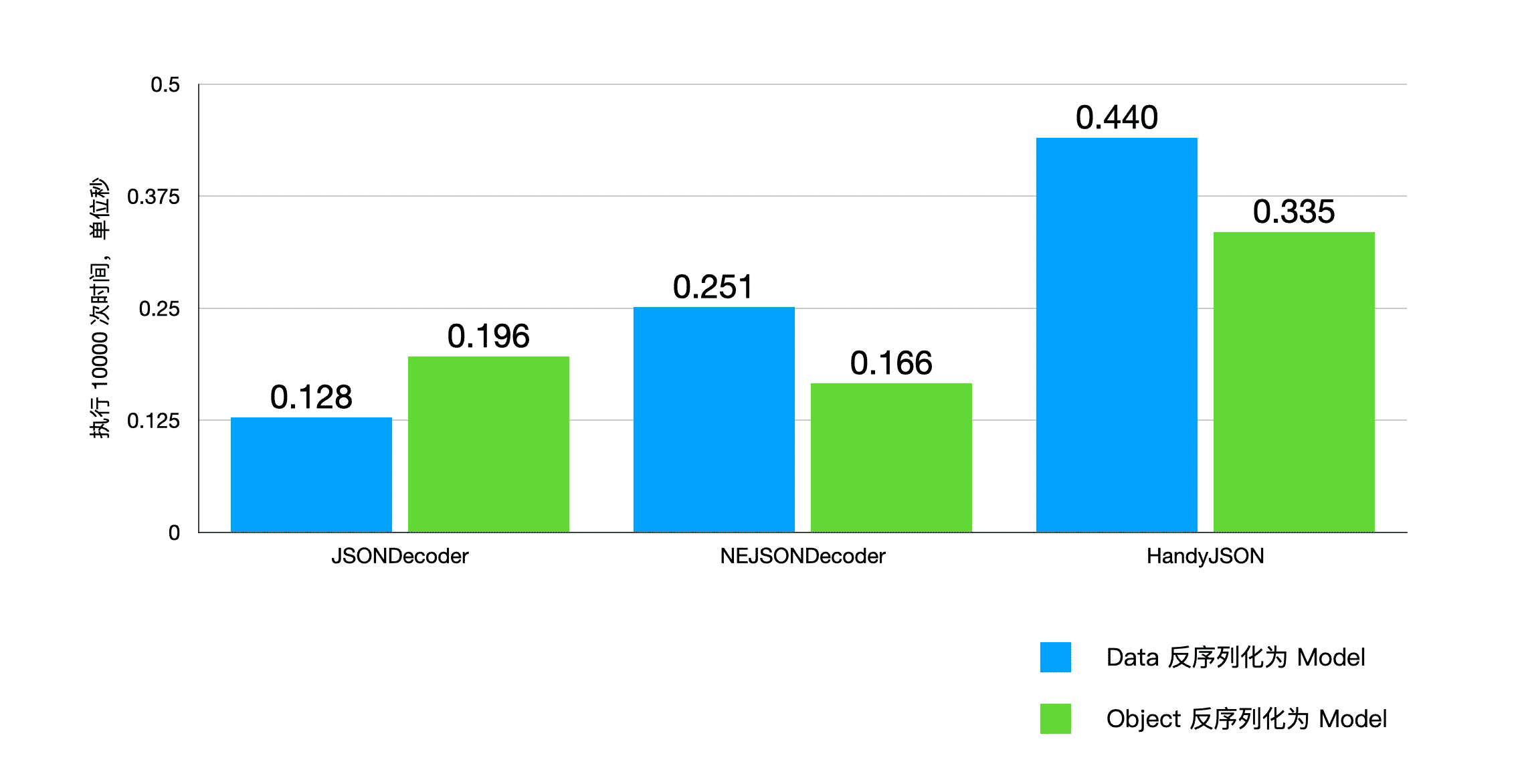 上图是各反序列化库执行 10000 次后得到的结果,可能看到从 Data 数据转换为 Model 时 JSONDecoder 性能最佳,从 JSON Object 传换为 Model 时 NEJSONDecoder 性能最佳,HandyJSON 耗时均最长