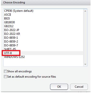 点击Tools-global options-code-saving调整text encoding为‘utf-8',关闭窗口重新再次导入