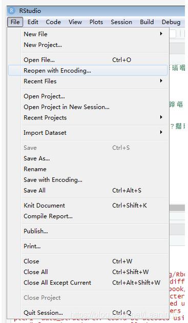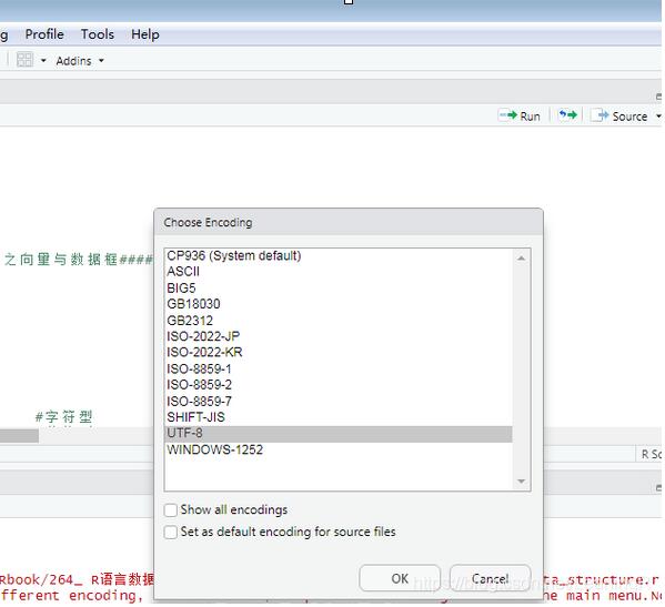 导入R代码,出现乱码,依次点击File-Reopen with encoding-Choose encoding-'utf-8'确认