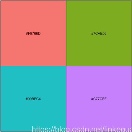 ggplot2分组时默认使用的颜色,可以从另一个hadley写的包,scales包中调用。这个包算是一个工具包,用于和hadley写的其他包配合使用,颜色是其中一部分。