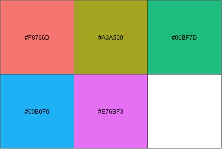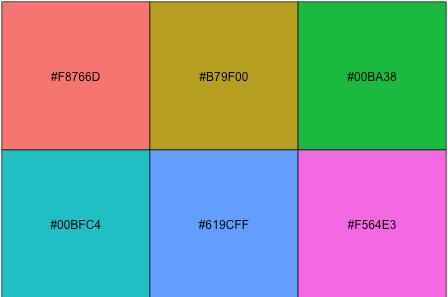 个人觉得它默认的配色系统很不错,但看到颜色后却不知道这种颜色叫啥,今天就来介绍一下,如果你有1~6个元素,ggplot2给的配色分别是啥。