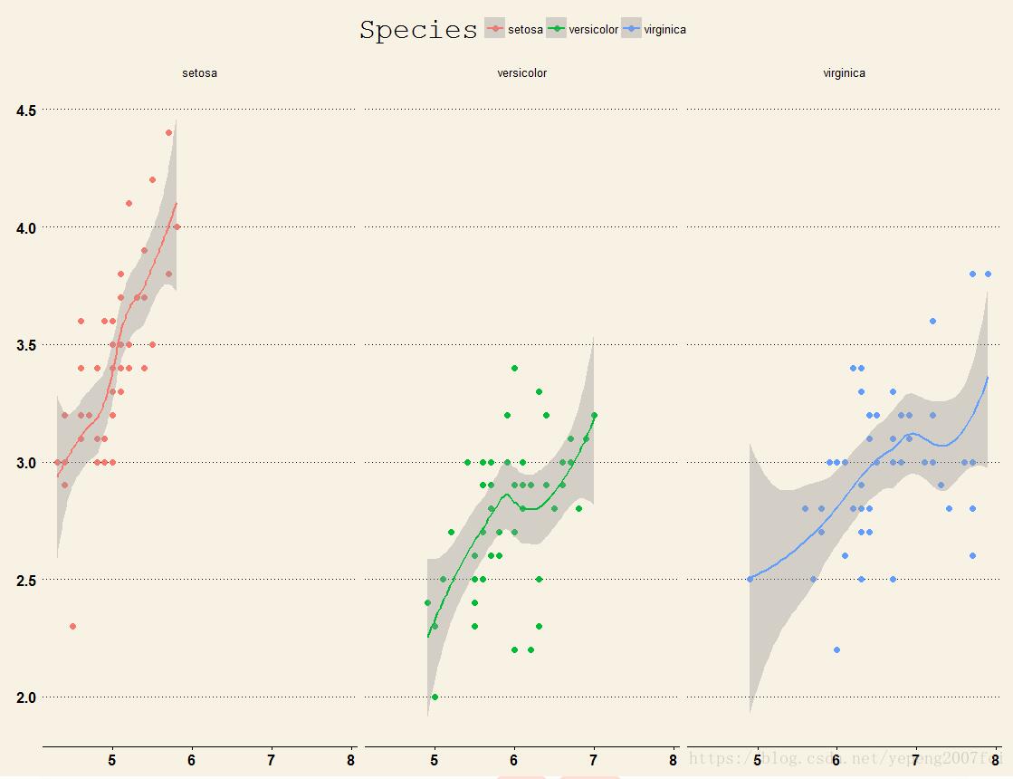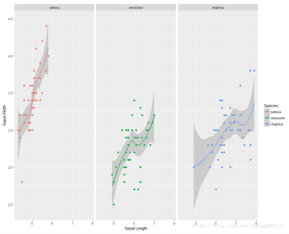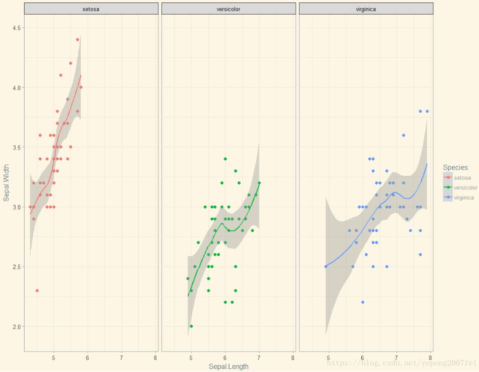 4. 通过分面后对比效果好了不少,如果想看下不同物种下花萼长度与宽度的关系呢?可以使用+geom_smooth(method = "loess"),效果图如下: