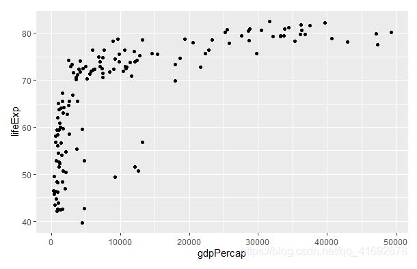 plot <- ggplot(gapminder_2007, aes(x = gdpPercap, y = lifeExp)) +