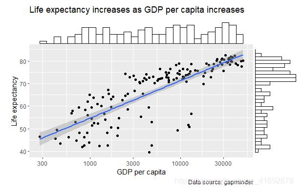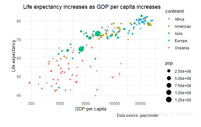 看的出来lifeExp与gdpPercap存在近似lifeExp=log(gdpPercap)的关系,对x轴的数值进行log值处理。另外,为了呈现更多信息,用颜色标记国家所在的洲,并用点的大小表示人口数量。