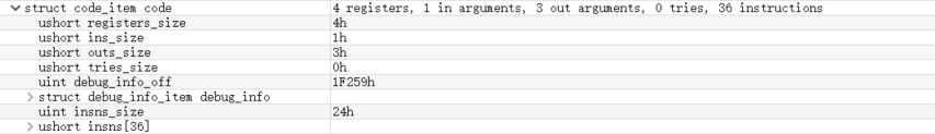 CodeItem是dex文件中存放函数字节码相关数据的结构。下图显示的就是CodeItem大概的样子。