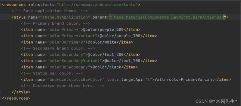 <style name="Theme.MyApplication" parent="Theme.MaterialComponents.DayNight.DarkActionBar">修改为: