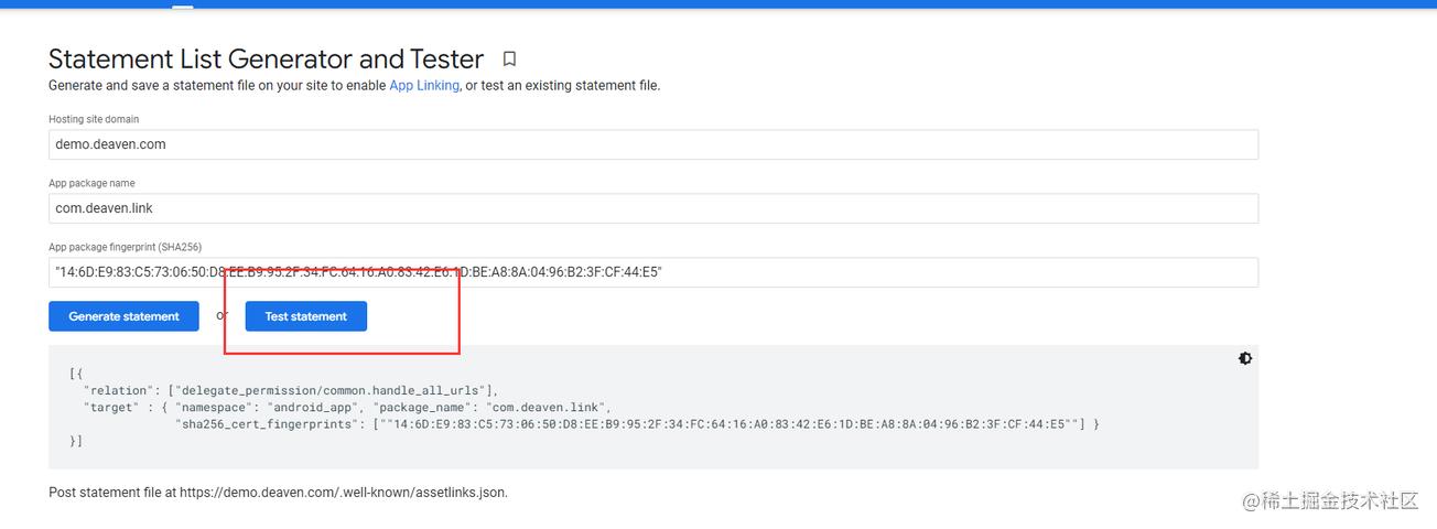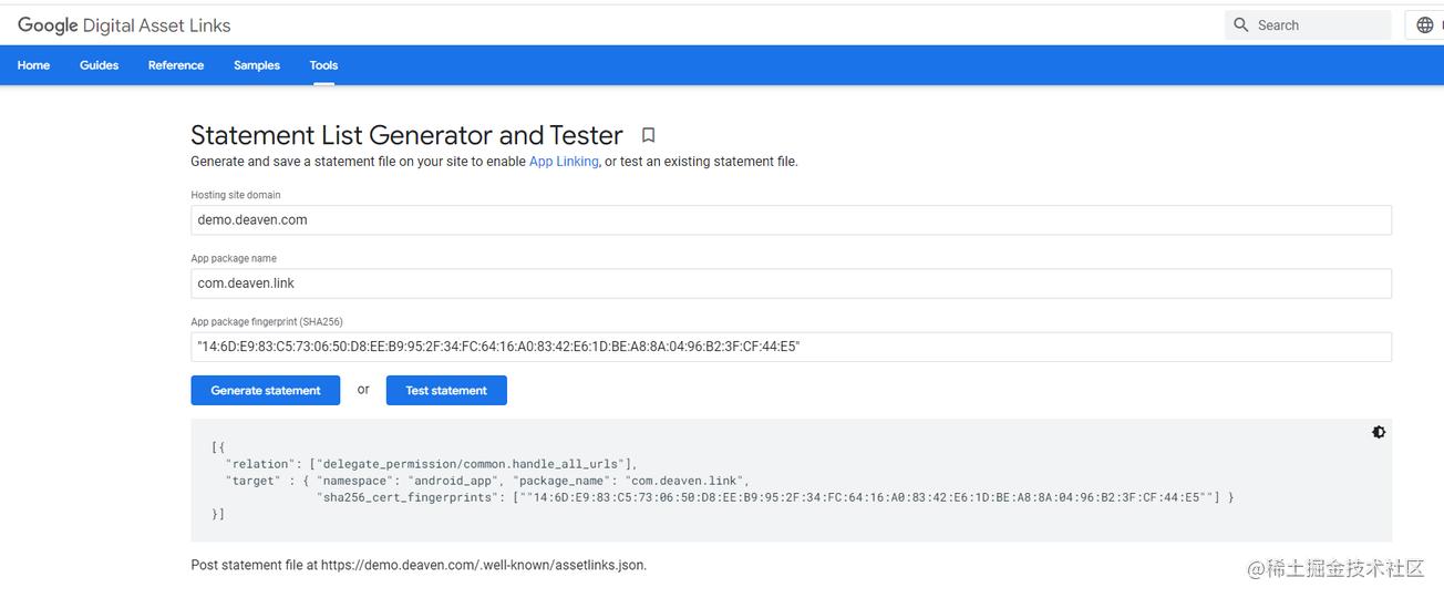 我们的host为demo.deaven.com,那么我们就需将assetlinks.json放到https://demo.deaven.com/.well-known/assetlinks.json并可以正常访问。你也可以在 https://developers.google.com/digital-asset-links/tools/generator检查服务器上assetlinks.json是否可访问如下图:
