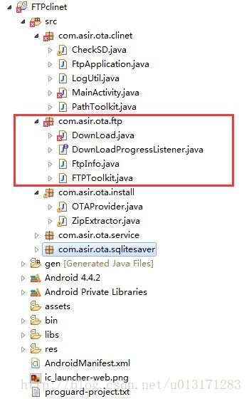 那么相关ftp的操作,已经被封装到ota.ftp这个包下,各位童鞋可以下载示例代码慢慢研究。另外这个要是用ftp服务我们cline端需要再项目工程导入ftp4j-1.7.2.jar包