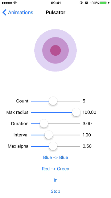 脉冲数量、速度、半径、透明度、渐变颜色、方向等都可以设置。可以用于地图标注(Annotation)、按钮长按动画效果(例如录音按钮)等。