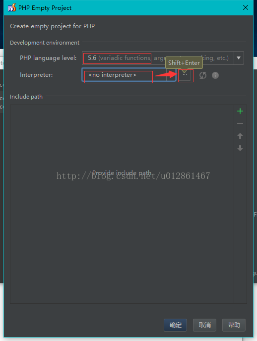 第一步:打开PhpStorm软件,点击创建新项目,在输入框填写项目名称,项目存放地址,项目类型信息。