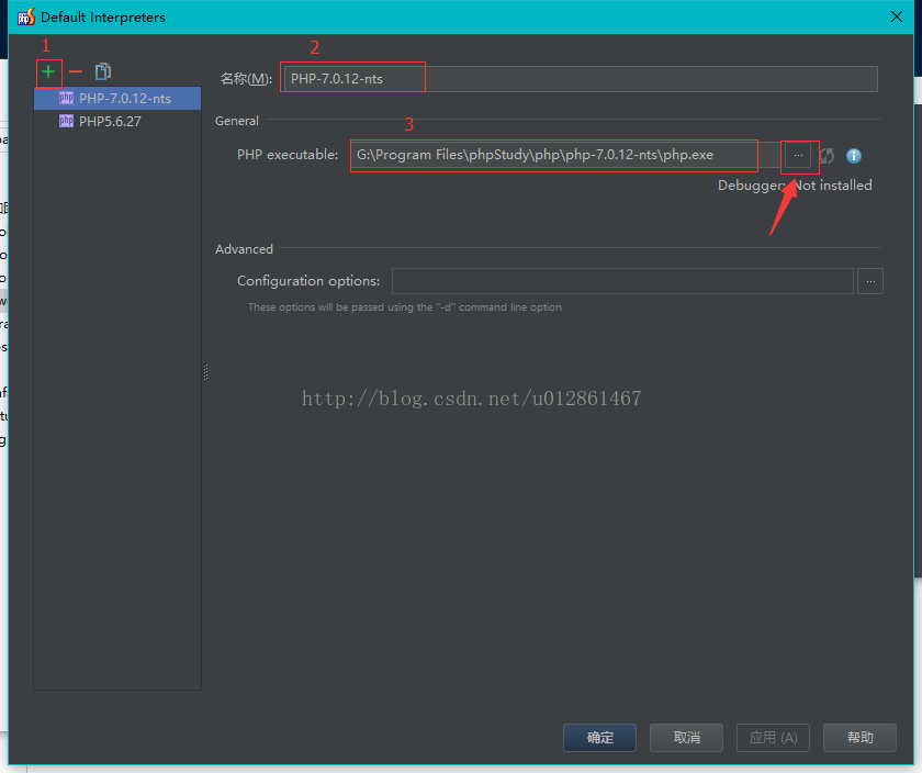 位置1 填写配置的名称,位置2填写我们本地服务器的地址,这里是“localhost”,端口默认是80,Debugger默认就好了,也可以去配置Xdebug,这里不重点讲。填写完成之后点击:应用->确定。