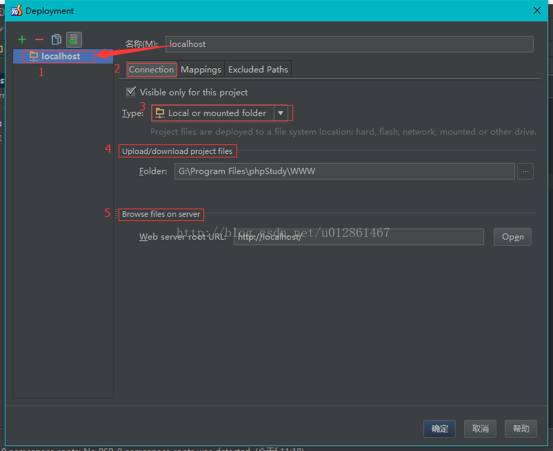 位置4是项目在本地服务器的详细文件夹位置(相对于我们在 “Connection”设置的“Upload/download project files”位置,就是我们待会把源代码上传部署到服务器的文件位置),这里我指定为“/phpStudyTest”,待会工程上传的时候就会上传到“G:\Program Files\phpStudy\WWW\phpStudyTest”这个phpStudyTest文件夹下。