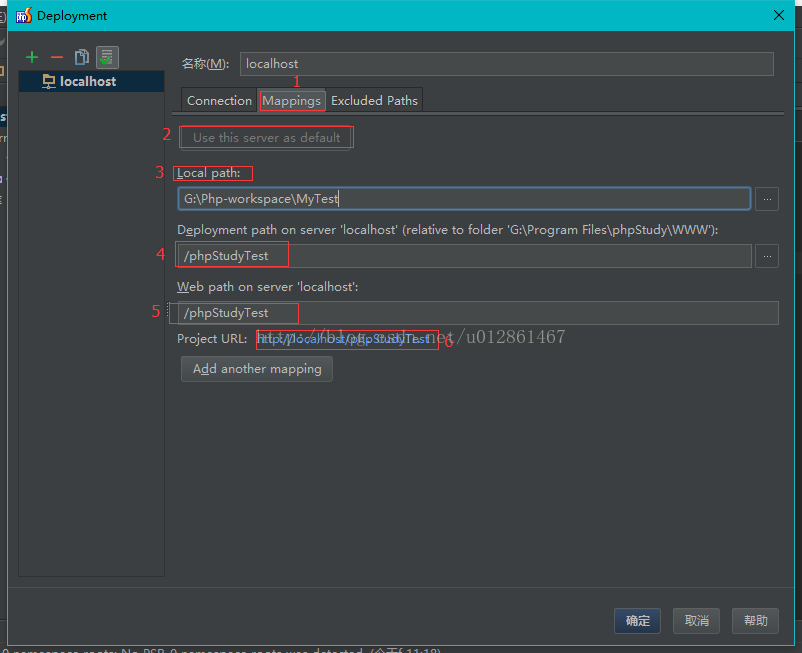 位置5是相对于我们在 “Connection”设置的"Browse files on server"的位置,我们的项目现在放到了“localhost”的根位置phpStudyTest文件夹下了,所以设置为“/phpStudyTest”。