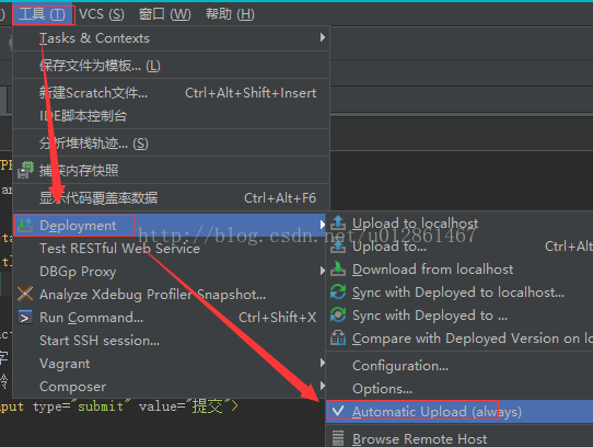 如果不想每次都手动上传,可以设置自动模式,自动模式下当我们修改了文件并保存之后,软件自动把修改的文件上传到服务器。设置如下: