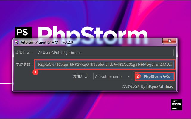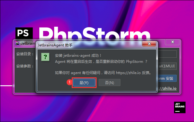 在下载的phpstorm永久激活补丁文件夹中有个叫做"安装参数.txt"的文件,打开此文件把里面的内容复制到上图标注1处的输入框中,然后点击上图标注2处“为phpstorm安装”按钮弹出“安装jetbrains-agent成功”提示窗口如下图