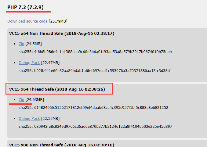 这里需要注意,下载的 PHP 版本信息,因为在接下来下载 Apache 时,需要与之对应,不然在整合 Apache + PHP过程中你,将会缺少相关的配置文件信息。
