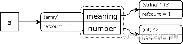 数组变量本身($a)在引擎内部实际上是一个哈希表,这张表中有两个zval项 meaning和number,所以实际上那一行代码中一共生成了3个zval,这3个zval都遵循变量的引用和计数原则,用图来表示: