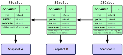 在工作目录中有三个文件,准备将他们暂存后提交。暂存操作会对每一个文件计算校验和(SHA-1哈希串),然后把当前版本的文件快照保存在 Git 仓库中(Git使用blob类型的对象存储这些快照), 并将校验和加入暂存区域。 当使用 git commit 新建一个提交对象前,Git 会先计算每一个子目录的校验和吗,然后在 Git 仓库中将这些目录保存为树(对象);之后 Git 创建的提交对象,除了包含提交信息外,还包含了指向整个树对象的指针。这样将来需要的时候,重现此次快照的内容了。