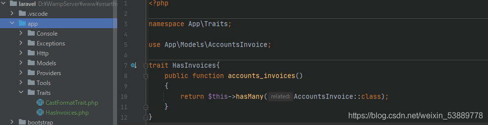 本人由于数据库操作上使用了eloquent模型,在多表查询时需要指定表格关系。在多个表中都使用了hasmany()关联到了主表。于是便把这一段代码块单独提出来并放入了名为HasInvoices的Trait中,文件目录在App\Traits下。注意Trait名与文件名应该相同。