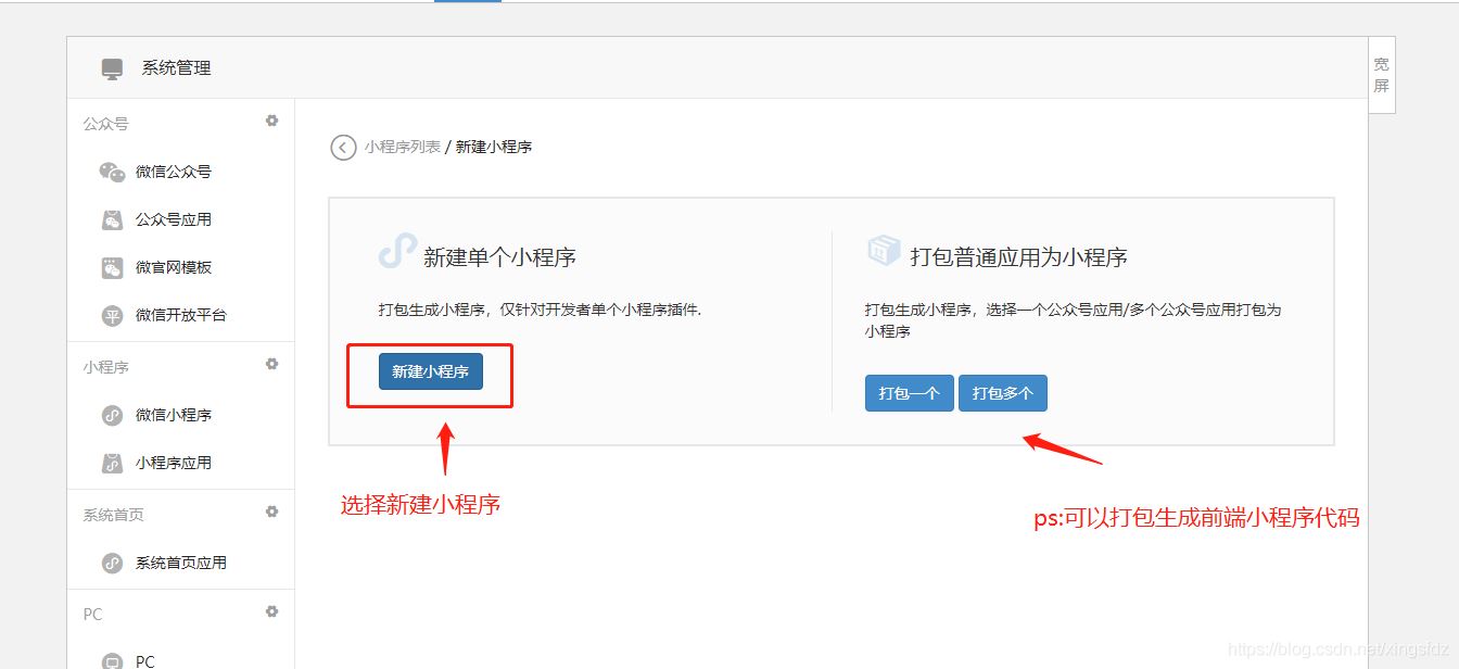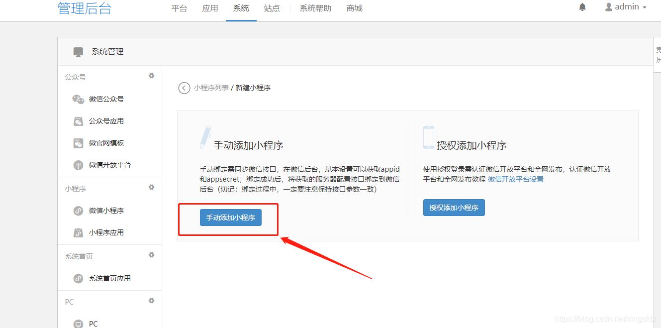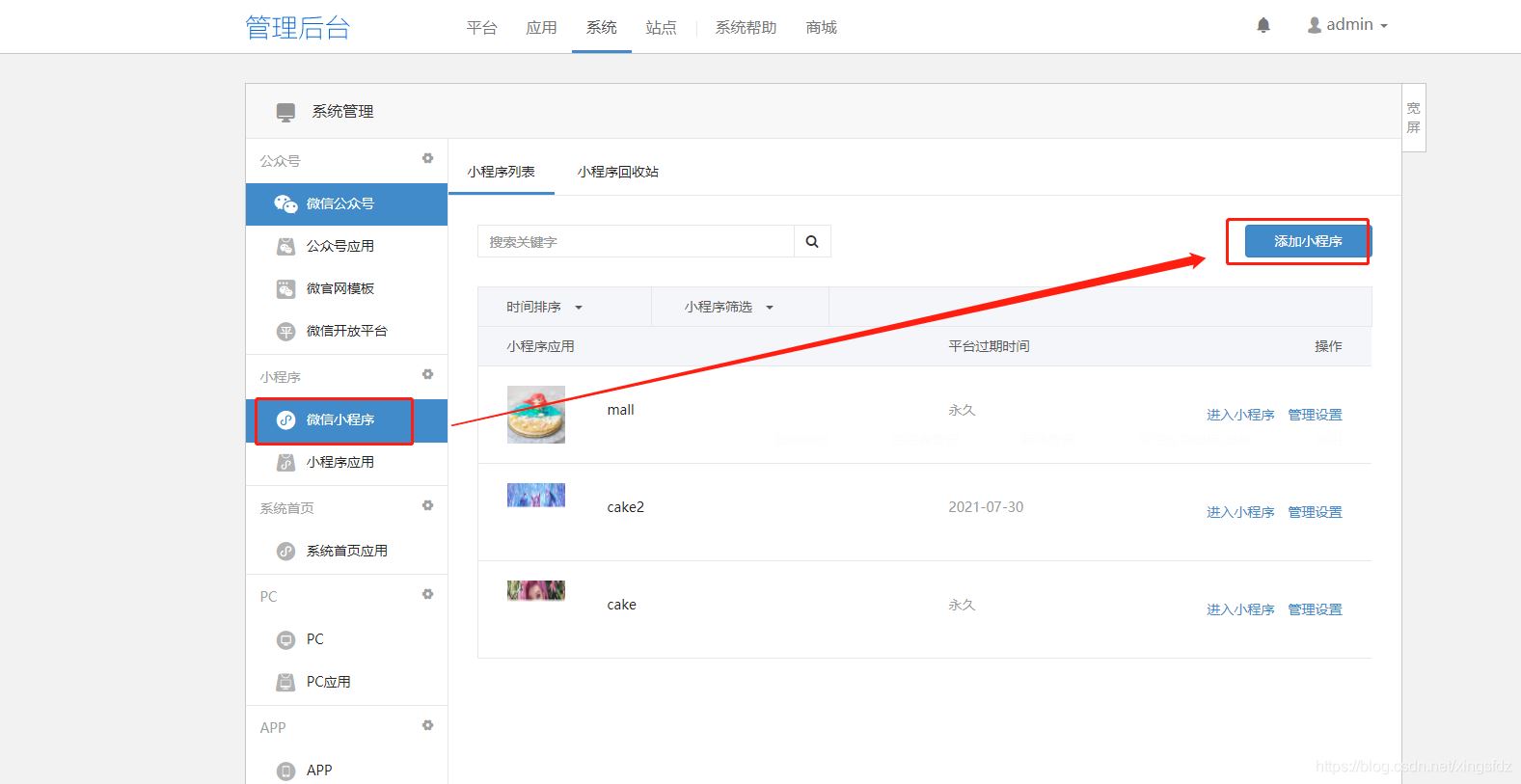 由于我这边是配置微信小程序 所以 点击微信小程序->添加小程序: