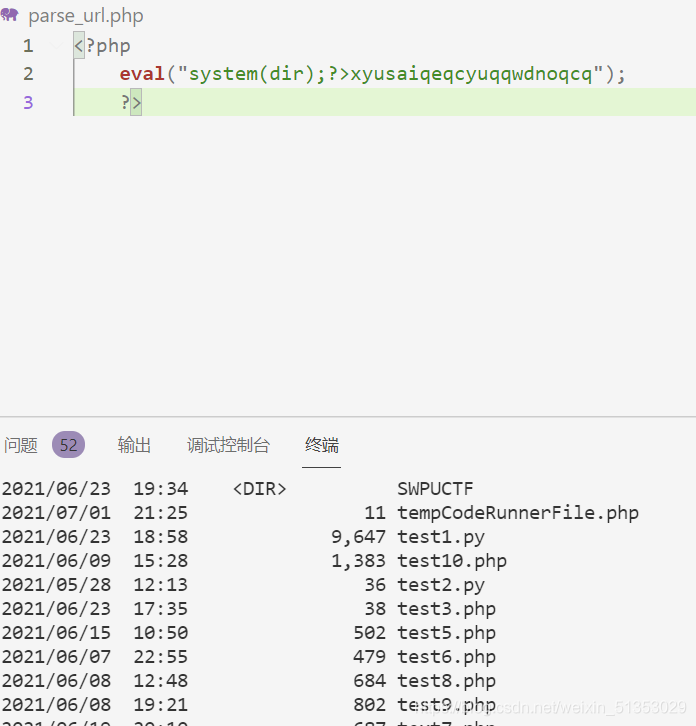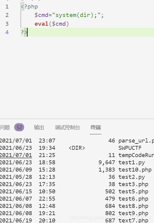 eval()这个函数可以理解成我们是将eval(字符串)这里面的字符串放到了一个新的php里面去运行,这个新的php本来就又 <?php 所以当我们传入 system(dir);?>dasdas的时候,?>就以及阶段了php代码