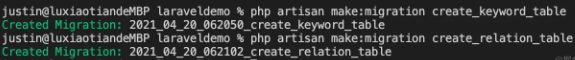 上述语法提及到的关系键是指在关系表中的字段名。 创建关键词模型: php artisan make:model Keyword