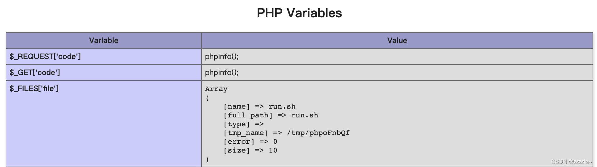 phpinfo 页面会将当前请求上下文中所有变量都打印出来,若我们直接向 phpinfo页面送包含文件的 post请求,则即可在返回包里找到 $_FILES 变量的内容,从而拿到临时文件名