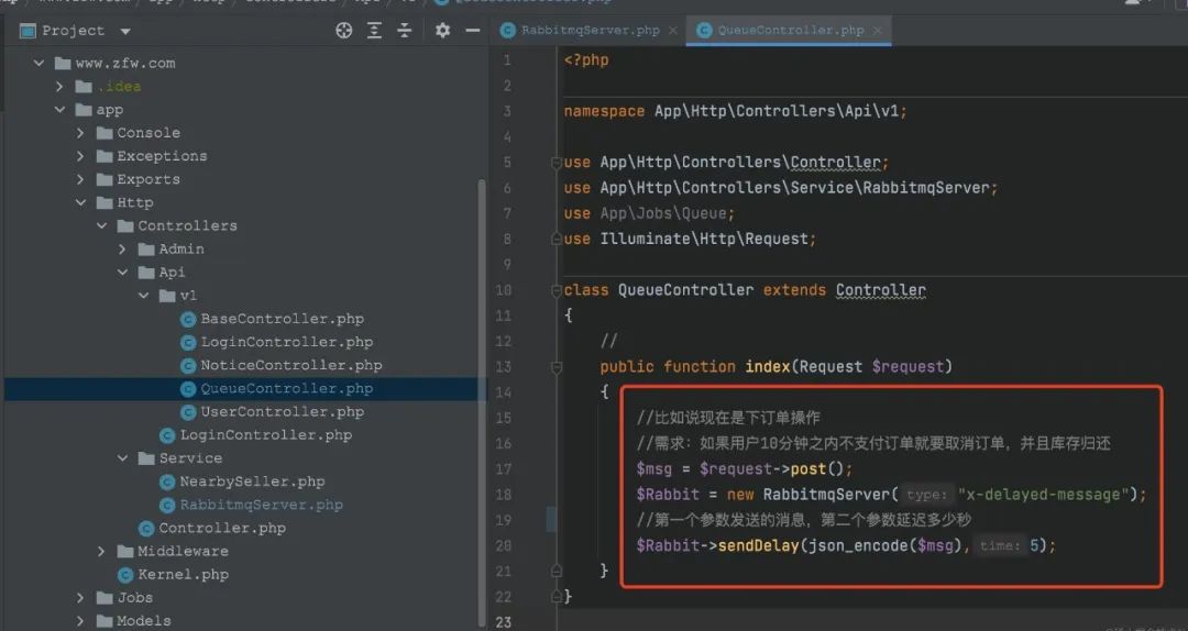 }比如新建QueueController控制器,进行测试生产消息放到延迟消息队列中