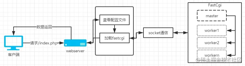 - php-fpm 接收到请求,启用 worker 进程处理请求