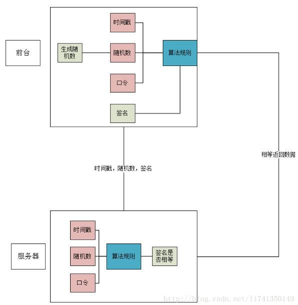 前台生成一个签名,当需要访问接口的时候,把时间戳,随机数,签名通过URL传递到后台。后台拿到时间戳,随机数后,通过一样的算法规则计算出签名,然后和传递过来的签名进行对比,一样的话,返回数据。