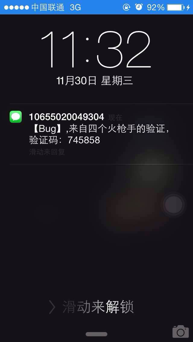 $content="[Bug],来自四个火枪手的验证,验证码:".$num;//要发送的短信内容,随便设置