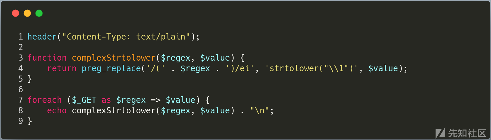 这个案例实际上很简单,就是 preg_replace 使用了 /e 模式,导致可以代码执行,而且该函数的第一个和第三个参数都是我们可以控制的。我们都知道, preg_replace 函数在匹配到符号正则的字符串时,会将替换字符串(也就是上图 preg_replace 函数的第二个参数)当做代码来执行,然而这里的第二个参数却固定为 'strtolower("\\1")' 字符串,那这样要如何执行代码呢?