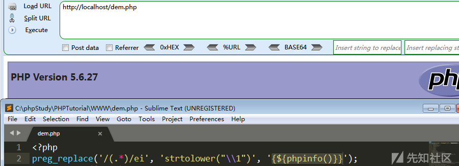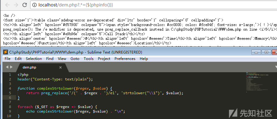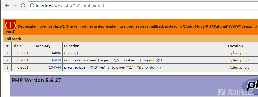 var_dump(preg_replace('/(.*)/ie','strtolower("{${phpinfo()}}")','{${phpinfo()}}'));// 结果:空字符串''