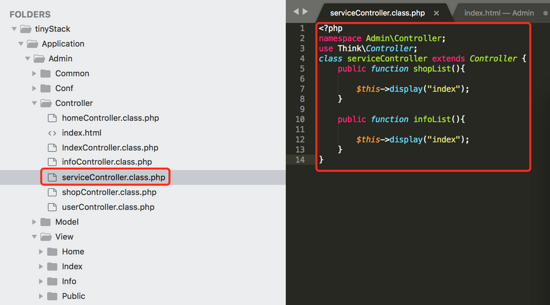 2.1 首先我们在admin模块中创建一个service控制器,我们把service控制器当成是后台管理系统的服务模块。在这个控制器中我们创建一系列的菜单模块并跳转至同一主页实现接口的统一。
