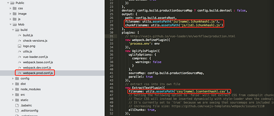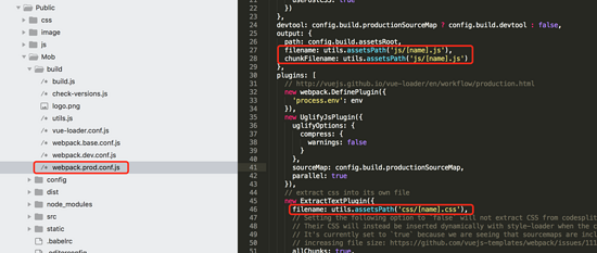 2.4 因为默认的vue单页打包的页面文件名会添加哈希后缀,为了统一引入方便我们在webpack.prod.conf.js中修改配置文件将哈希后缀删除